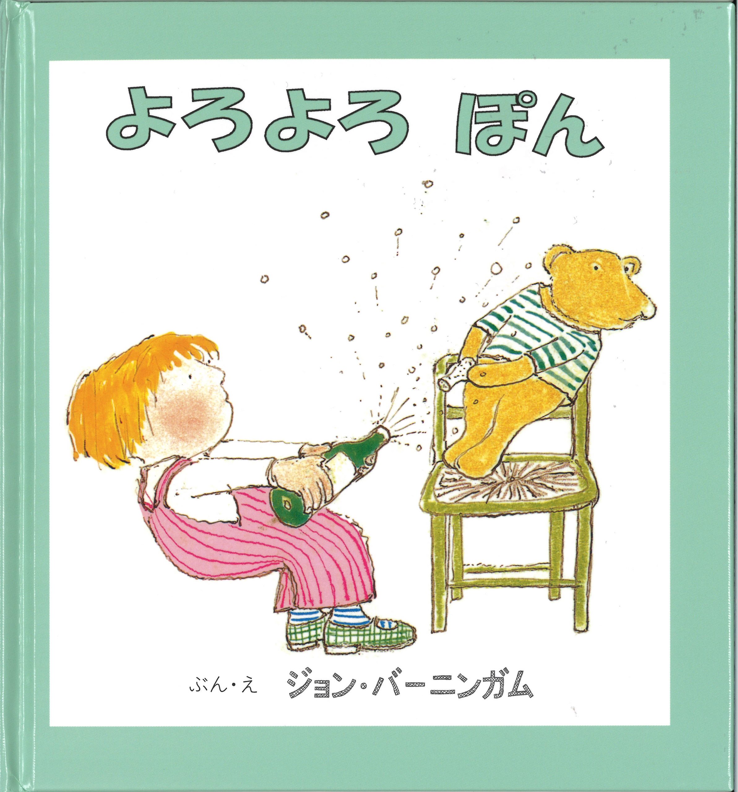 男の子とぬいぐるみのくまくんが、水道から水をバケツにくんで、おうちにおでかけです。でも、とんでるカを「うつ」と、よろけてバケツの水を「こぼす」。そして、こぼれた水を「ふく」「しぼる」。