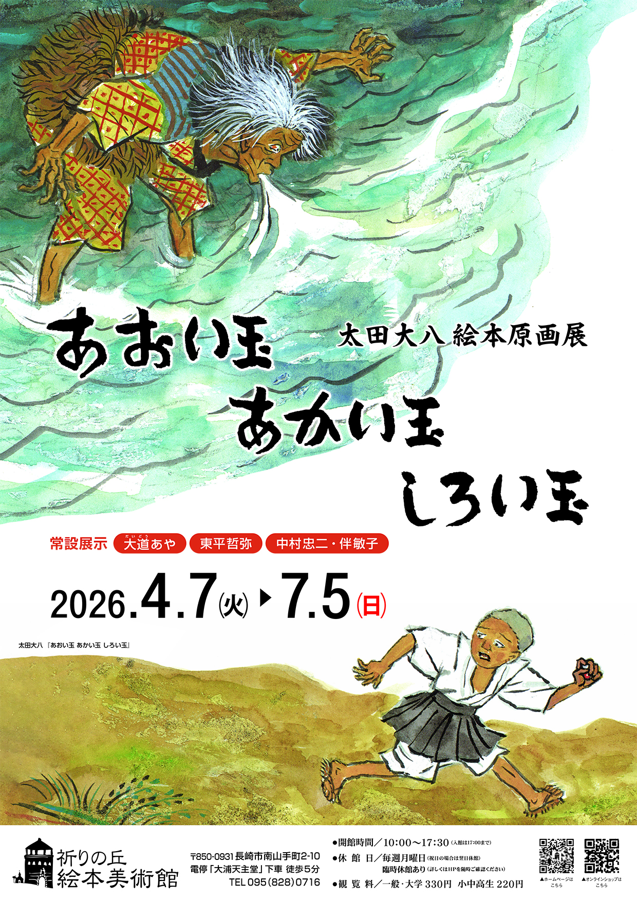 祈りの丘絵本美術館では、2階大フロアにて、4/7(火)~7/5(日)まで、「太田大八絵本原画展 あおい玉あかい玉しろい玉」を開催中です。